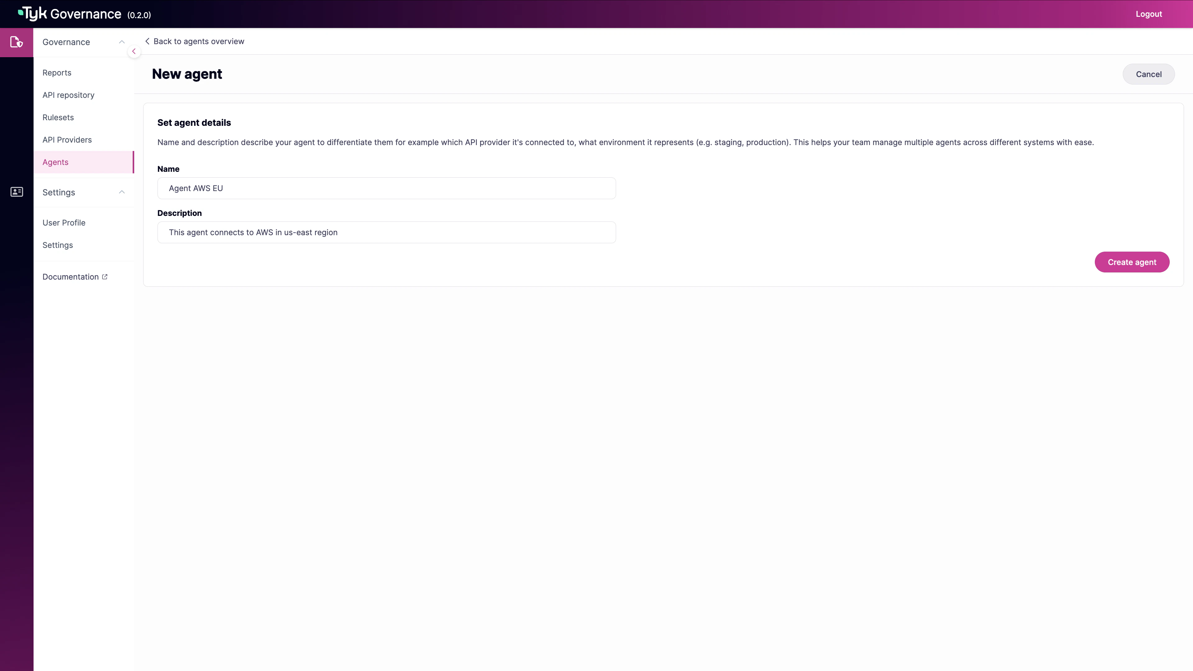 - Description: Details about the agent’s purpose or location (required)