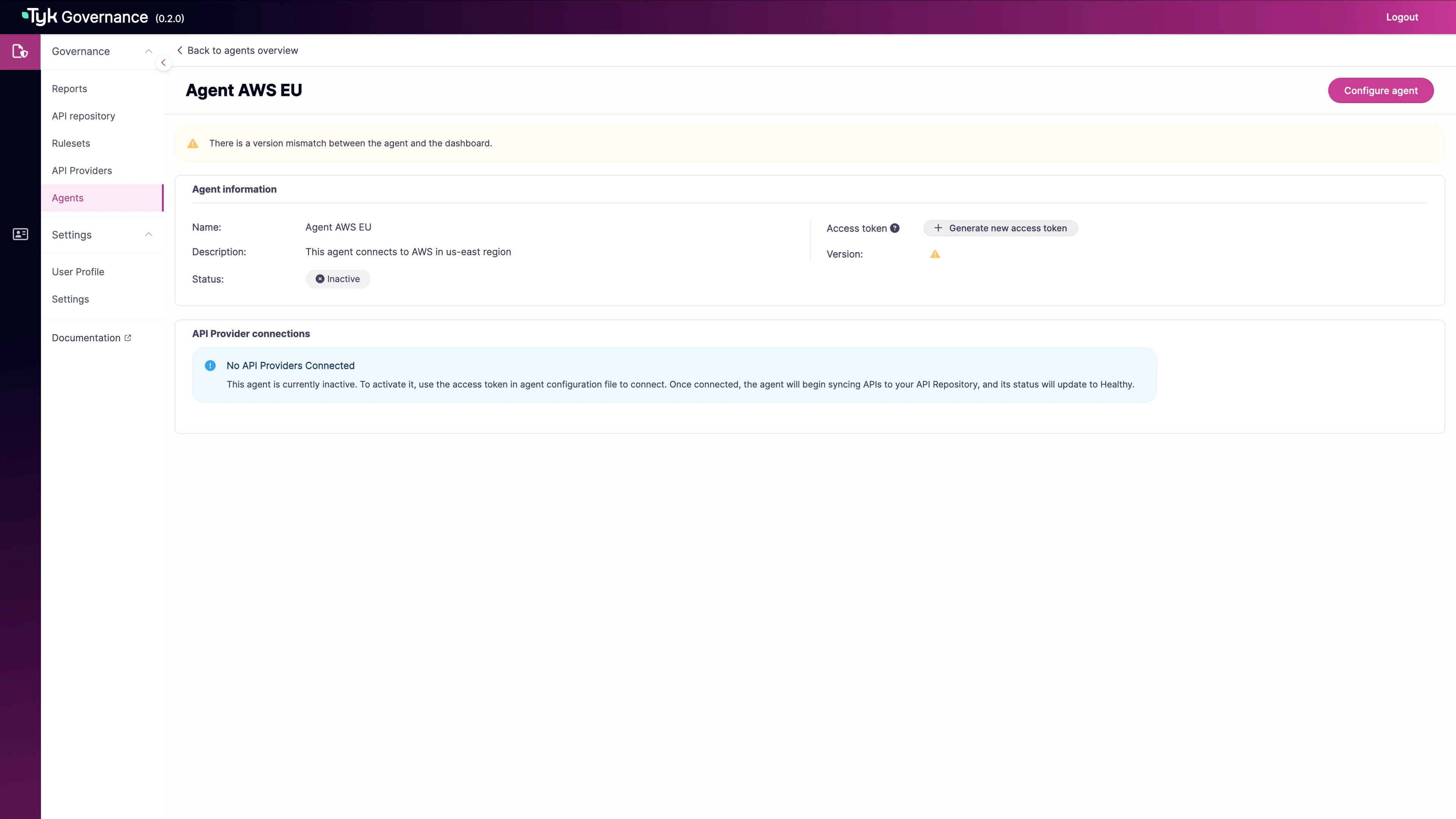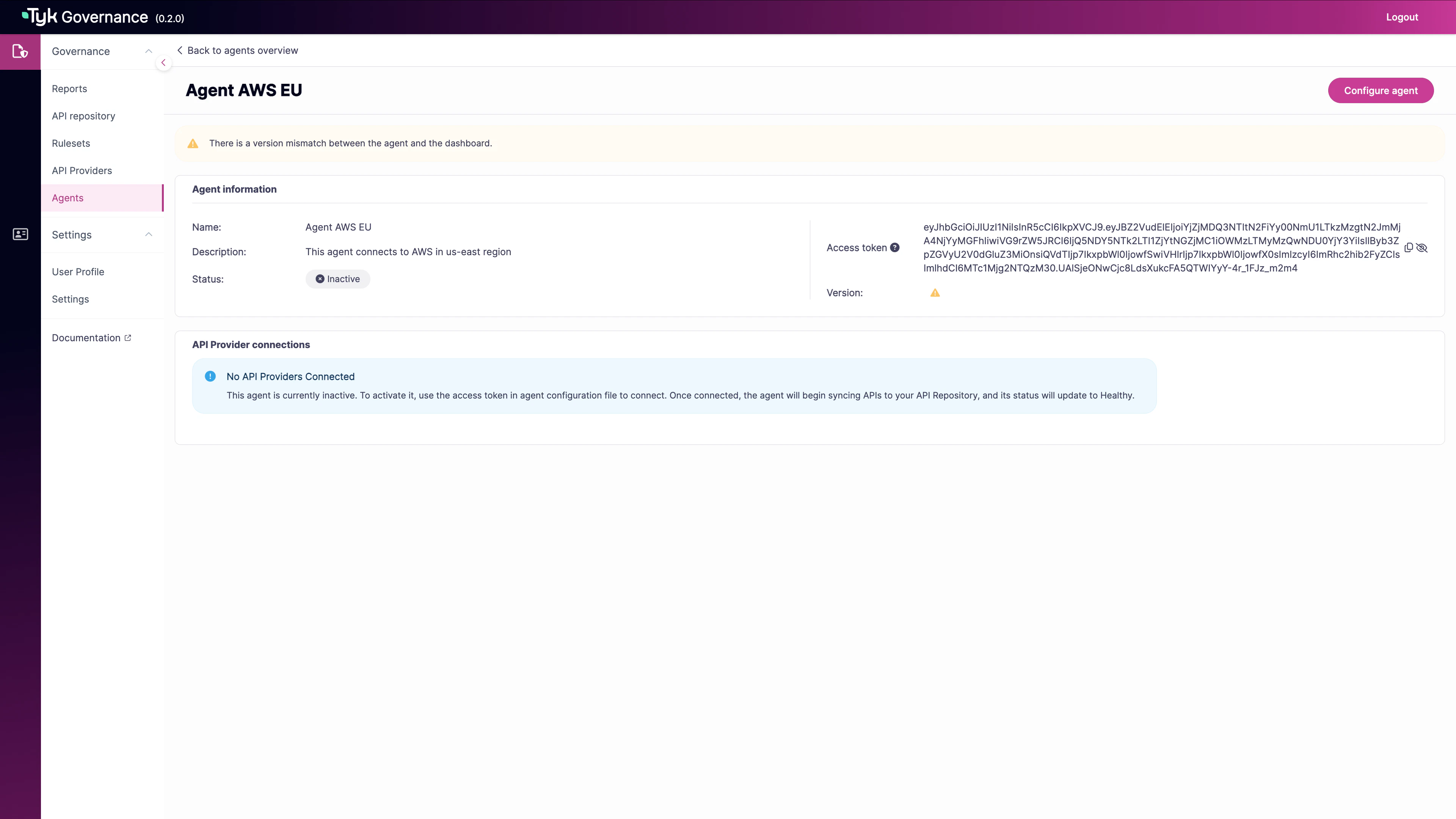 - Network connectivity between the agent and both the Governance Hub and your API provider